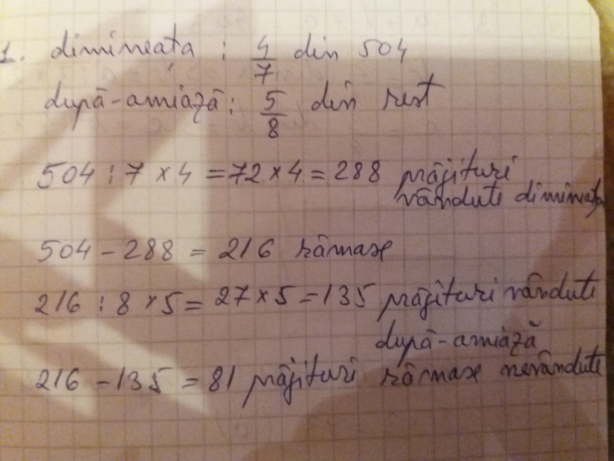 - 1.La o cofetărie s-au pregătit 504 prăjituri. Dimineața s-au vândut 4/7 din numărul prăjiturilor, iar după-amiază 5/8 din rest. Câte prăjituri a rămas nevândute?
