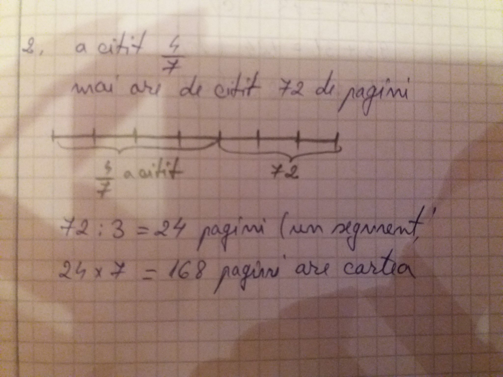 - 2. După ce a citit 4/7, Ana observă că mai are de citit 72 de pagini. Câte pagini are cartea?