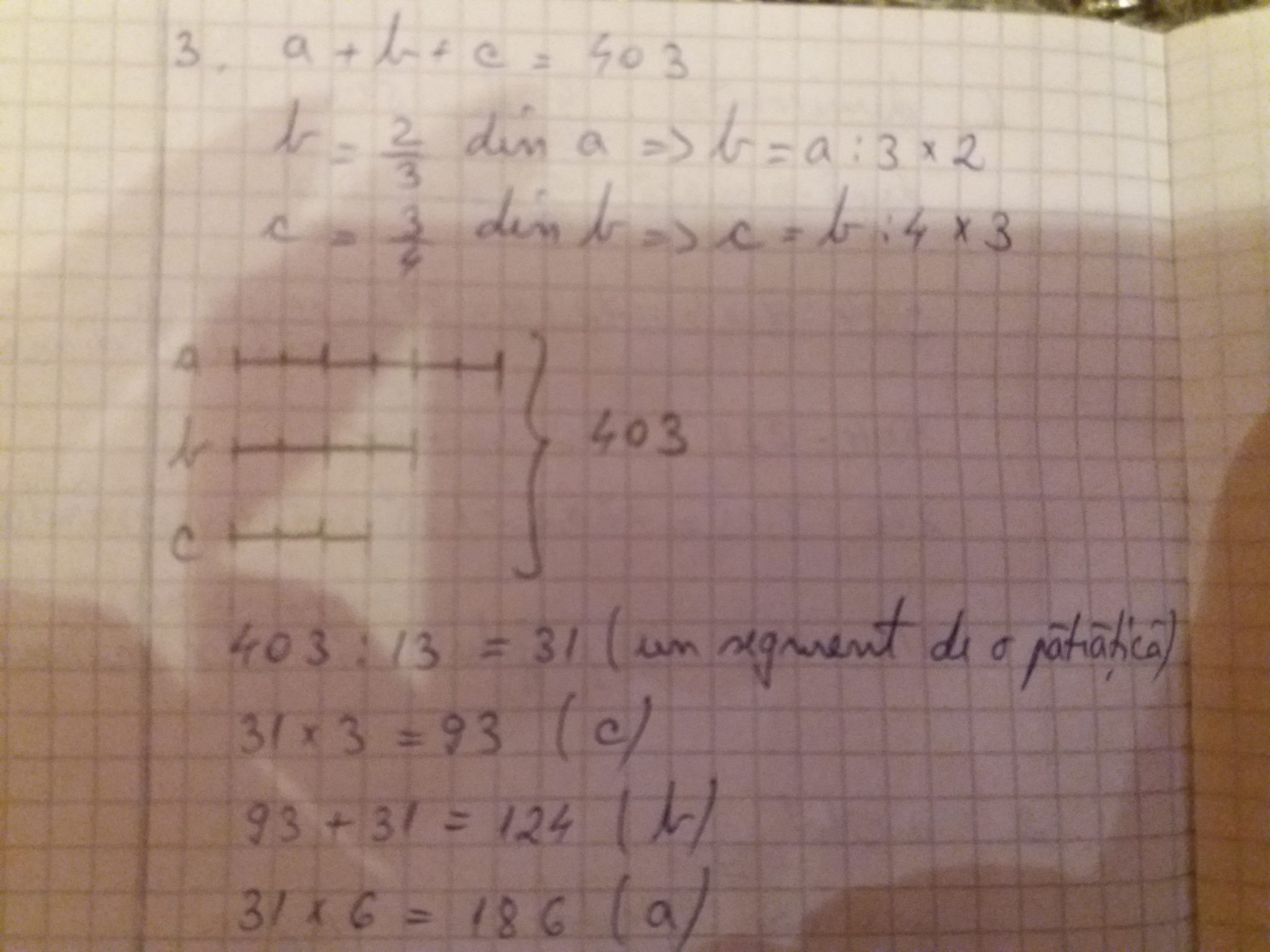 - 3. Suma a trei numere e 403. Al doilea număr este 2/3 din primul, iar al treilea este 3/4 din al doilea. Care sunt numerele?