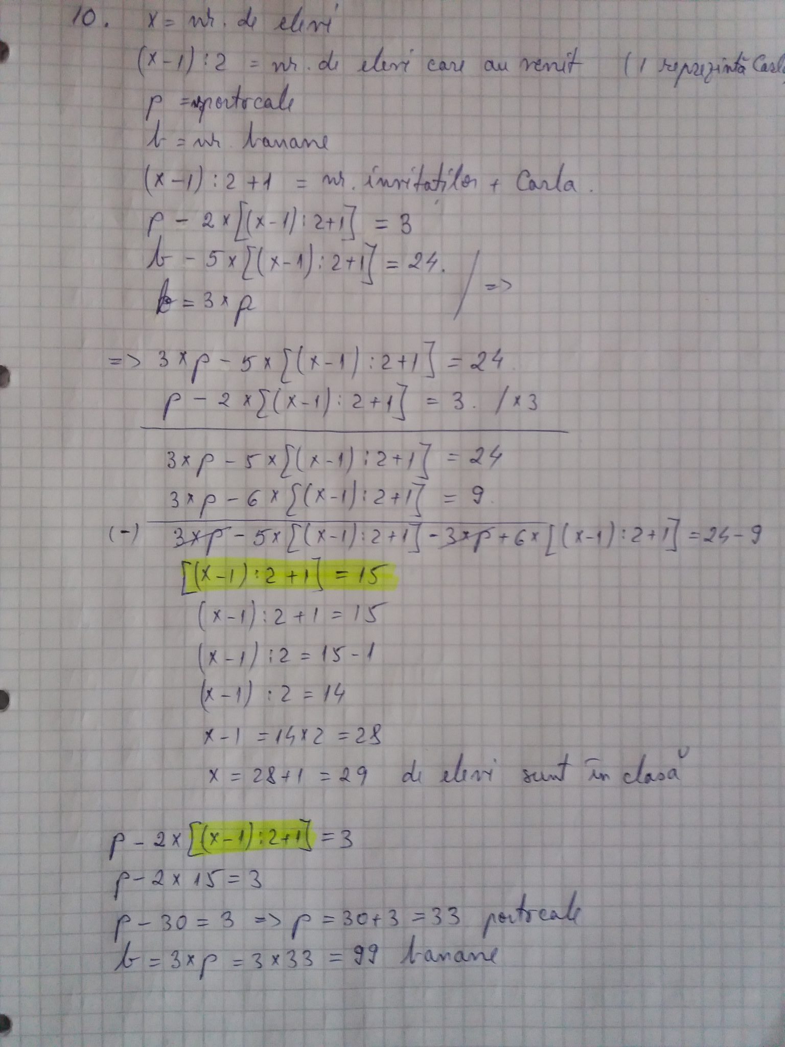 - e. De ziua sa, Carla a invitat colegii de clasă la petrecere. Au venit numai jumătate dintre aceștia. Invitaților și sărbătoritei li s-au pus pe masă portocale și de trei ori mai multe banane.